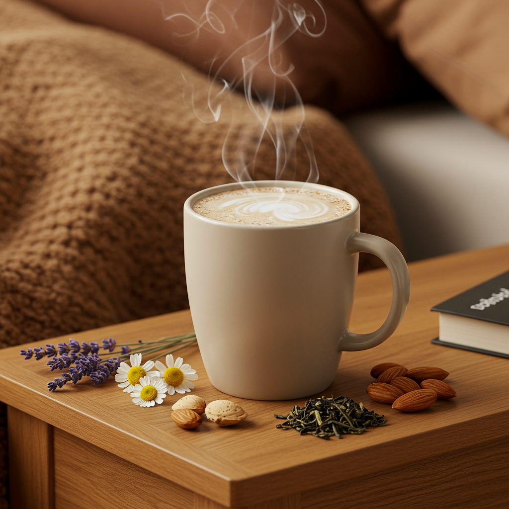 - 재료: 디카페인 에스프레소 1샷 (또는 진하게 내린 디카페인 커피 50ml), 따뜻한 우유 (또는 아몬드 우유) 150ml, L-테아닌 파우더 100~200mg (선택 사항), 캐모마일 티백 1개, 꿀 약간 (선택 사항)