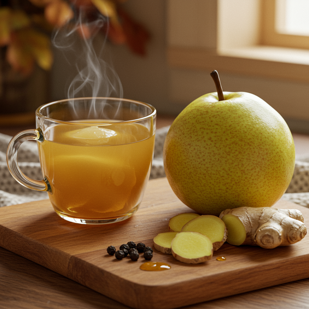 - 재료: 배 1개, 생강 1쪽 (약 20g), 통후추 5~7알, 꿀 또는 설탕 (기호에 따라)