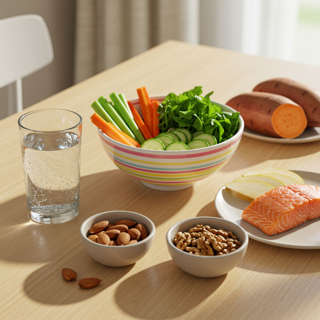 - 저녁: 고구마나 통곡물 위주의 탄수화물, 제철 채소를 활용한 반찬