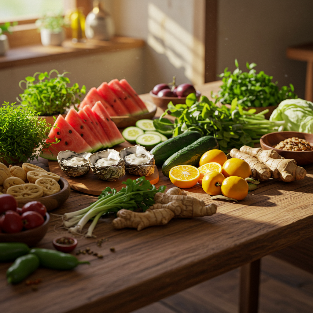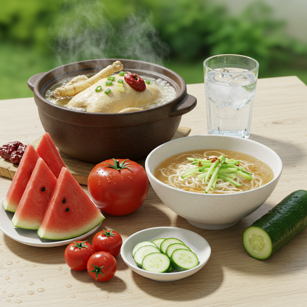 삼계탕, 민어탕, 콩국수는 여름철 대표 보양식으로, 단백질과 필수 영양소를 공급하여 체력 보강에 도움을 줍니다. 특히 콩국수는 식물성 단백질이 풍부하고 시원하게 즐길 수 있어 더위에 지친 입맛을 돋우는 데 좋습니다. 또한, 오이, 수박, 토마토와 같이 수분 함량이 높은 채소와 과일은 갈증 해소는 물론, 체내 열을 내리고 비타민과 미네랄을 보충해 주는 여름철 최고의 선물입니다. 이들을 통해 여름철 지친 몸에 활력을 되찾고 건강하게 여름을 날 수 있습니다.
